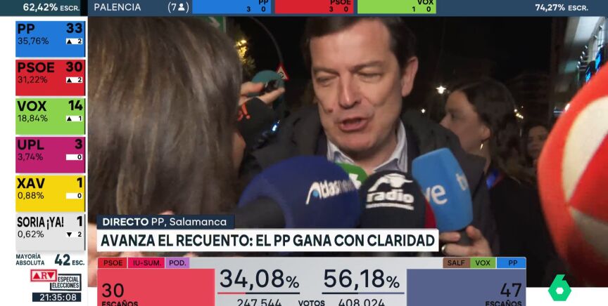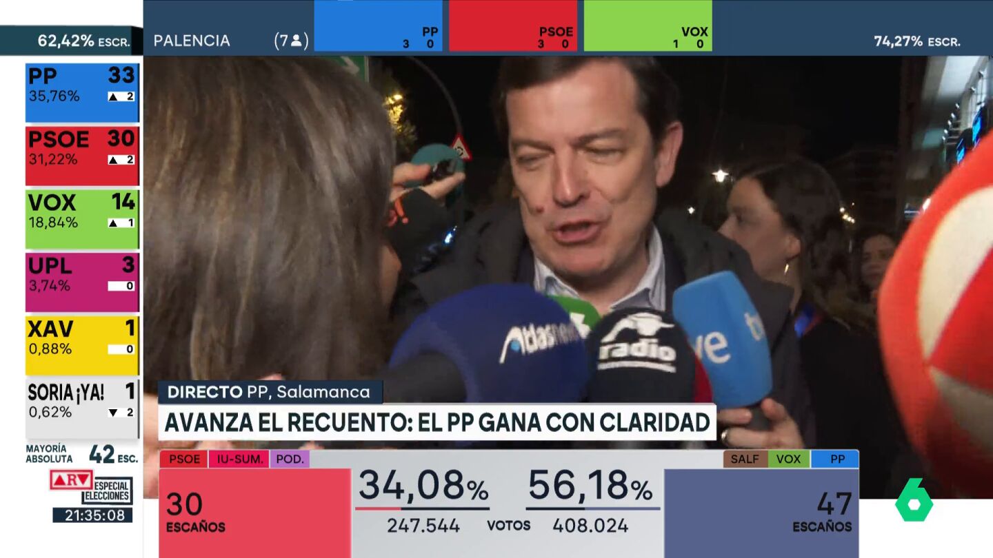 Sobre si tendrá que meter a Vox en el Gobierno, Mañueco ha apuntado que están "todos muy contentos", pero "hay que terminar el escrutinio". Sobre si le ha llamado alguien de Vox para felicitarle ha contestado que no que le ha llamado "nadie de nadie". Aunque sí ha añadido que ha hablado con el líder del PP, Alberto Núñez Feijóo.