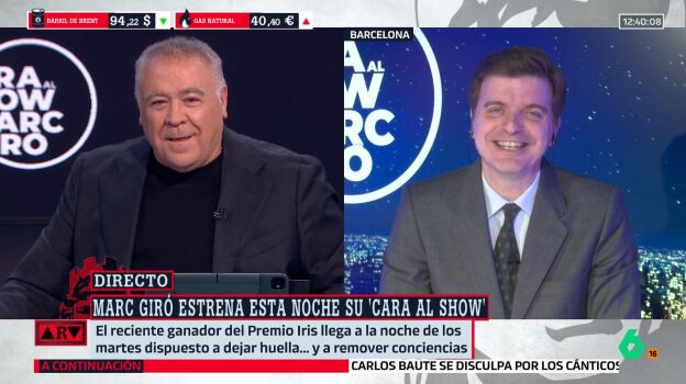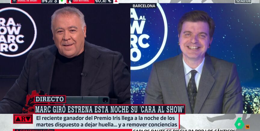 Marc Giró ha destacado a Antonio García Ferreras como la verdadera estrella de laSexta, durante una conexión entre ambos presentadores. Giró, quien estrena su programa "Cara al Show", expresó su desacuerdo con Ferreras, quien inicialmente se refirió a Giró como la estrella del canal. Ferreras, con humor, se autodenominó "el poeta de laSexta" y bromeó sobre ser un "inquiokupa" de su despacho debido a Giró. En un vídeo, Giró aparece insistiendo en entrar al despacho de Ferreras, bromeando sobre su insistencia. Ferreras, entre risas, dejó que el público decidiera quién es la verdadera estrella.