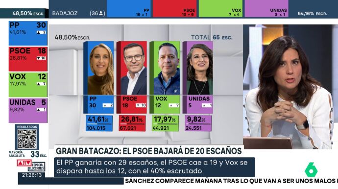 Con más del 50% de los votos escrutados en Extremadura, el PSOE ha experimentado una significativa pérdida de 10 escaños respecto a las elecciones de 2023, cayendo de 28 a 18 escaños. Este resultado refleja las previsiones de las encuestas y ha sido calificado como un batacazo electoral. María Llapart ha señalado que los resultados finales medirán el impacto de los recientes casos de corrupción y acoso en el PSOE. En el especial de Al Rojo Vivo, la periodista destacó la preocupación y el miedo entre los cargos intermedios del partido sobre su futuro.