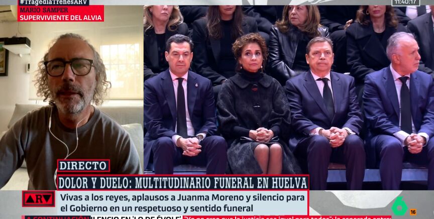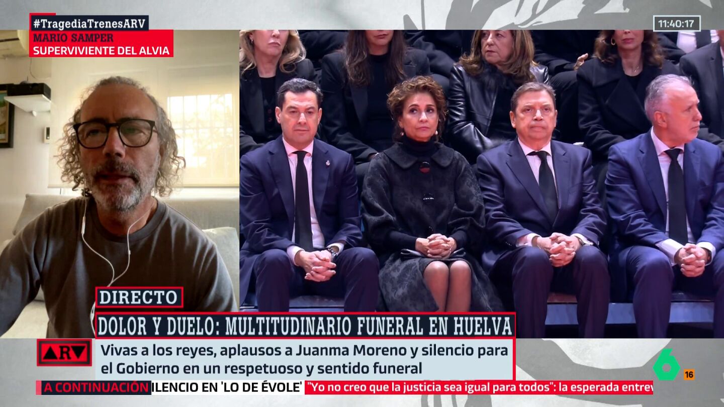 Un día después del funeral religioso por las víctimas de Adamuz, celebrado en Huelva, con la presencia de los reyes, miembros de la Junta de Andalucía, entre ellos, el presidente Juanma Moreno Bonilla, y del Gobierno de España (la vicepresidenta María Jesús Montero y los ministros Luis Planas y Ángel Víctor Torres), Mario Samper, superviviente del Alvia siniestrado, nos atiende en Al Rojo Vivo.