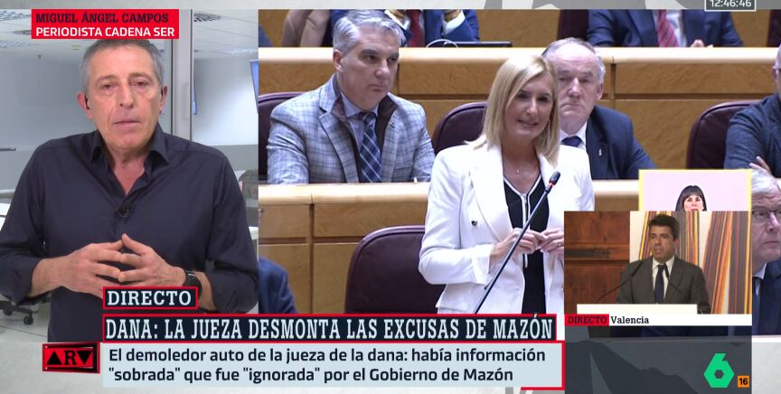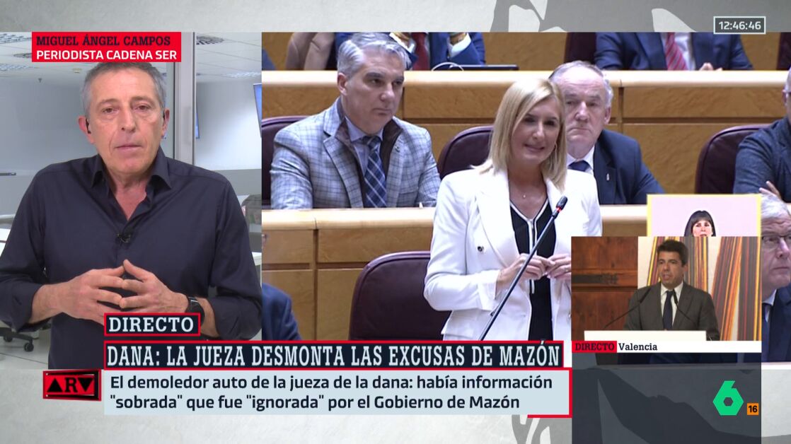 El periodista Miguel Ángel Campos, de la Cadena Ser, explica por qué la juez Nuria Ruiz Tobarra, la magistrada que instruye la investigación de la DANA, ha sido muy clara y contundente en su auto. Ha cuestionado el envío de las alertas a los móviles, recordando la información que ofrecían en tiempo real los medios de comunicación y ha señalado, así, que no supieron interpretar la información de la que disponían.