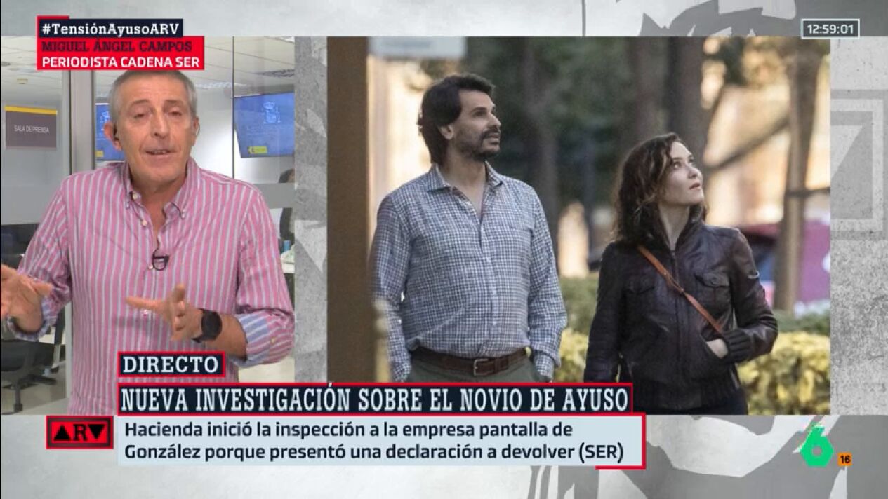 Isabel Díaz Ayuso ha reaccionado a la ampliación de la investigación sobre su pareja, Alberto González Amador, asegurando que España es un "estado policial" instaurado por el Gobierno que dirige Pedro Sánchez a través de lo que califica como abuso. Miguel Ángel Campos, periodista de la 'Cadena Ser' que ha informado de que su novio intentó desgravarse gastos de sus vacaciones conjuntas, responde a la presidenta de la comunidad de Madrid en este vídeo: "Ella habla da datos ilícitos y filtraciones ilícitas. Le diría que, simplemente, son datos que forman parte de un sumario judicial y al que tienen acceso todas las partes".
