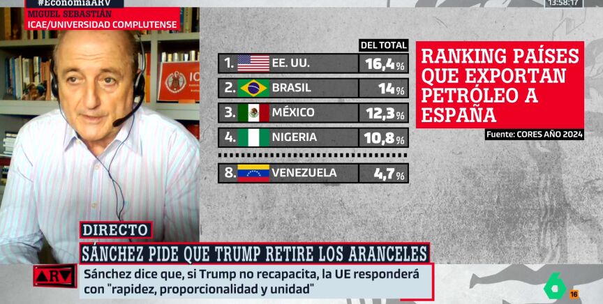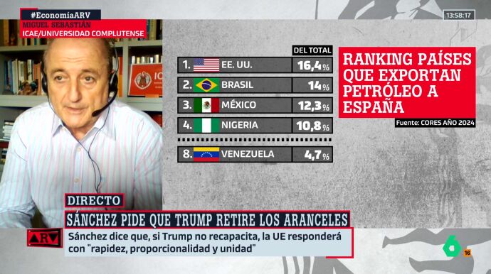 El profesor Miguel Sebastián ha explicado en Al Rojo Vivo que "el impacto para España es marginal, porque importamos poco de Venezuela". Sin embargo, advierte que lo preocupante es el mensaje que envía esta decisión: "Que vuelva a apuntar a Venezuela, cuando parecía que había quedado fuera del foco de la administración Trump, es una mala señal".