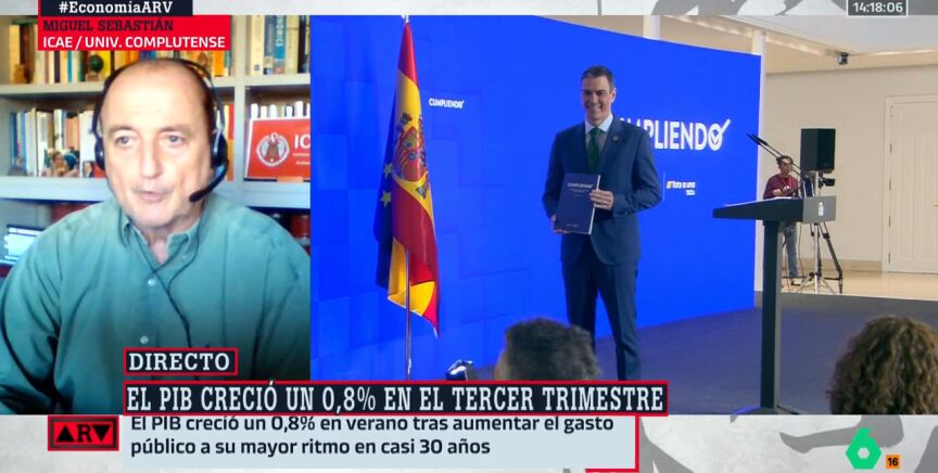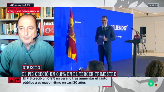 Miguel Sebastián, profesor de la Universidad Complutense de Madrid, analiza el dato del PIB del tercer trimestre del año: "Ha sido como se esperaba, un 0,8% y un 3,3%, pero claro, es el tercer trimestre, no quiere decir que vaya a acabar el año creciendo un 3,3% la economía española". "Nos queda el cuarto trimestre, que es el más flojo, y queda el impacto de la DANA", explica el experto, que detalla que "se estima que será de un 0,4%": "Esto hará bajar la tasa anual al 3%".