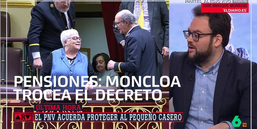 Ahora bien, lo que está garantizado y a salvo "es la subida del IPC de las pensiones", reitera Monrosi; sin embargo, "lo que más me preocupa son los mensajes que se están dando respecto a las personas que no tienen nada y que pueden perder sus casas esta semana". En el vídeo podemos ver al completo esta información así como la reacción del periodista de elDiario.es.