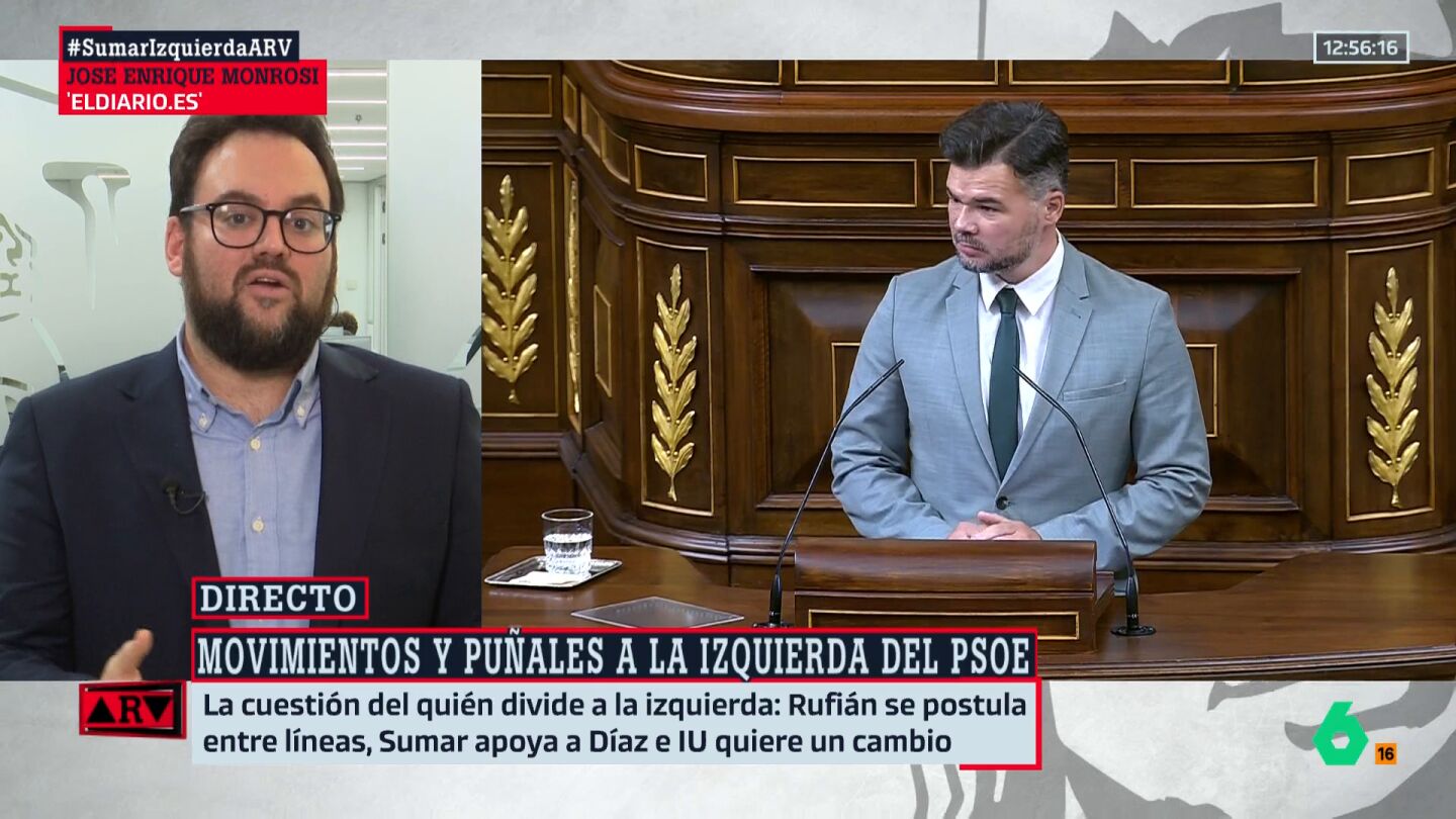 Ahora bien, insiste en que no tiene claro que Gabriel Rufián esté en condiciones de convertirse en, para que nos entienda la gente, el sustituto de Yolanda Díaz y se vaya a convertir en el candidato de Izquierda Unida, de Sumar o de Más Madrid. "Por la información que tengo, no veo a Gabriel Rufián saliéndose de Esquerra ni rompiendo con ella", afirma contundente Monrosi.