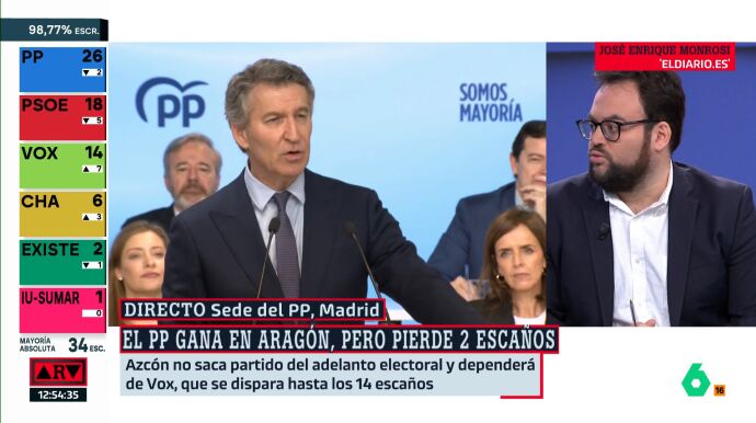 Tras los resultados de las elecciones en Aragón, el periodista de 'eldiario.es'José Enrique Monrosi considera que hay una conclusión clara: "Feijóo no tira ni aunque se hunda el PSOE". A su juicio, se trata de una evidencia ya detectada en anteriores convocatorias y en las encuestas, y que ahora "se constata en Aragón".