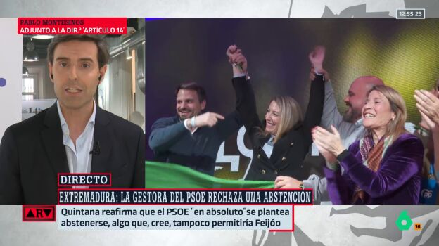 "María Guardiola está muy cansada de las negociaciones con Vox", afirma el periodista Pablo Montesinos, adjunto a la directora de Artículo 14. Desde el PP extremeño, creen que los de Abascal "están jugando al relato político y que no están hablando de medidas, ni siquiera de consejerías".Es más, apunta Montesinos que "según lo que dice el entorno de Guardiola, si de verdad se conocieran las negociaciones con luz y taquígrafo, más de uno alucinaría con cómo se están desarrollando". Guardiola está, informa Montesinos, según fuentes de su entorno, "harta de Vox, pero que no va a romper la mesa de negociación, a pesar de que creen que Vox no quiere ningún tipo de acuerdo".