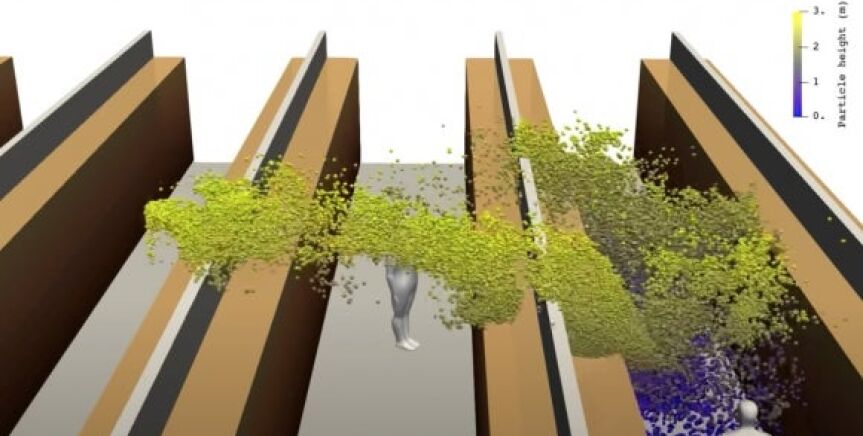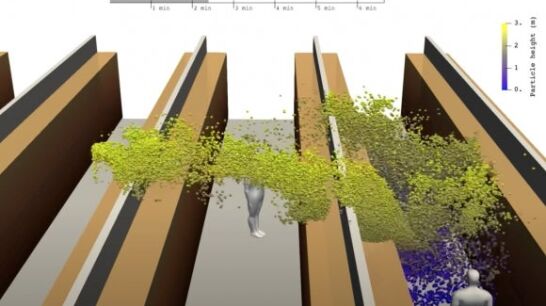 Así, el estudio analiza mediante varias simulaciones cómo al toser las partículas se quedan suspendidas en el aire envolviendo el ambiente y, aunque algunas caen al suelo, existen micropartículas que pueden quedarse al menos 20 minutos en suspensión.