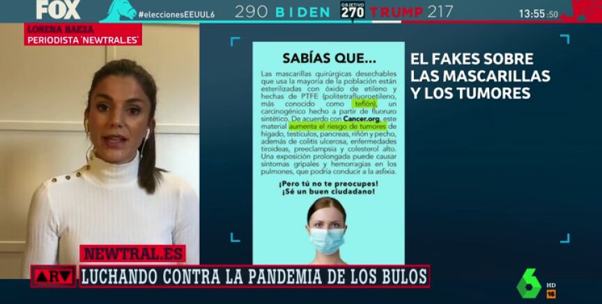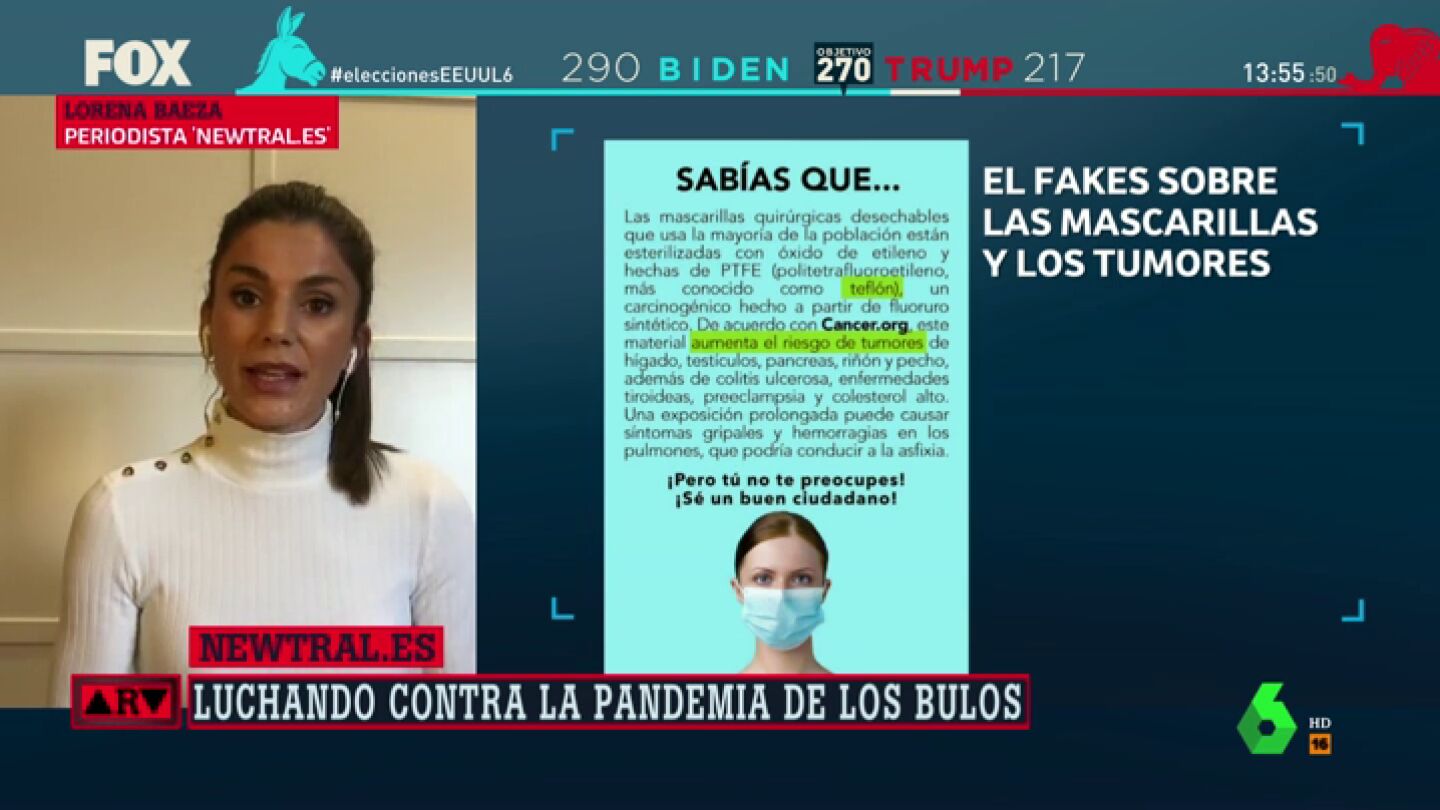 Ahora también se ha asegurado que aumenta el riesgo de tumores en hígado, testículos, páncreas, riñón y pecho. Pero tampoco es cierto. Se trata de otra mentira que se ha viralizado en redes sociales asegurando que contiene 'teflón'. Así lo ha verificado la periodista Lorena Baeza en 'Newtral', que ha explicado que lo que realmente se sabe sobre las mascarillas es que ni las quirúrgicas ni las FFP2 no llevan este material.