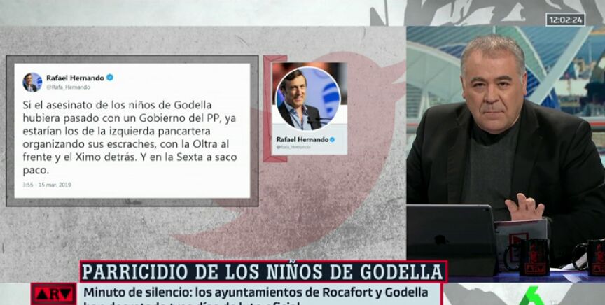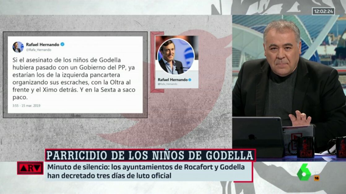 Antonio García Ferreras ha respondido a este "indecente" tuit en Al Rojo Vivo, afirmando que es absolutamente "deleznable y apestoso" utilizar una tragedia como esta para intentar conseguir votos "diciéndole a los tuyos mira que mala es la izquierda".
