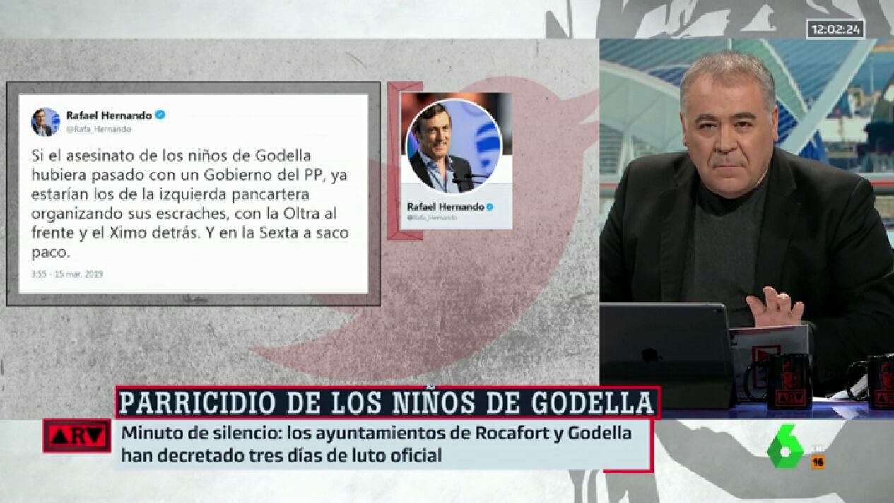 Rafael Hernando ha publicado un tuit criticando a la izquierda y a laSexta tras el crimen de Godella. En este vídeo, Ferreras responde a ese "indecente tuit", que califica de "apestoso".