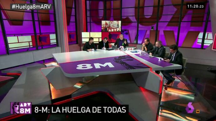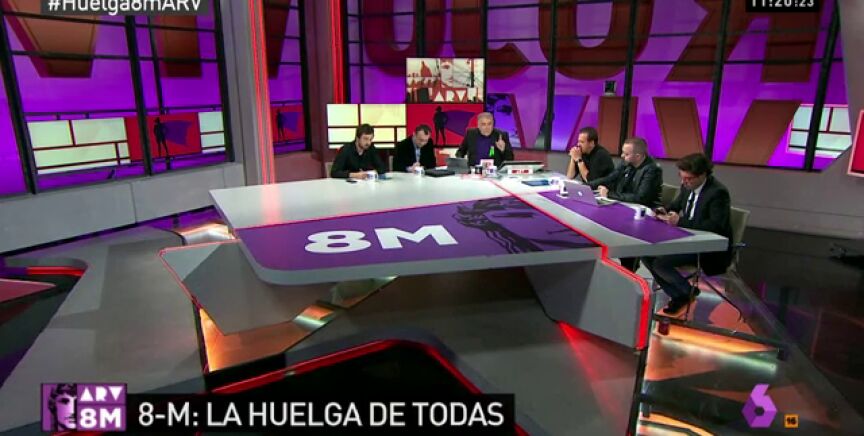 Antonio García Ferreras modera este 8 de marzo, Día Internacional de la Mujer, un debate en el que no hay mujeres porque las trabajadoras de laSexta están en la huelga feminista: "Hoy no hay mujeres en esta mesa y a lo mejor habitualmente cometemos un error y debería haber más".
