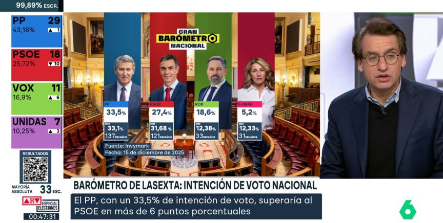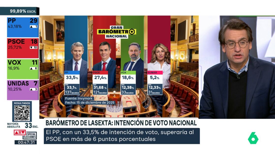 El barómetro de laSexta, elaborado a partir de los datos de Invymark, revelaba que el PP ganaría las elecciones generales con un 33,5% de los votos y superaría al PSOE en seis puntos si se celebrasen ahora.