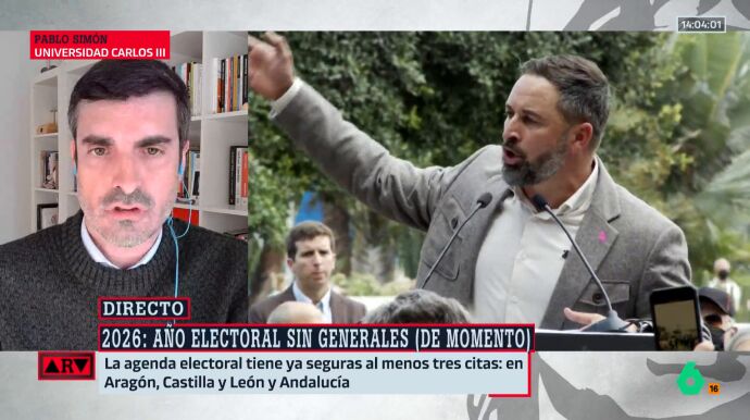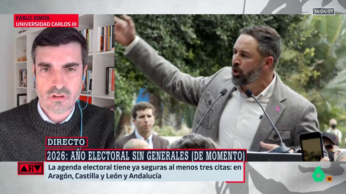 Para el politólogo Pablo Simón, el auge de Vox no sorprende: "A mí no me llama la atención porque ahora mismo Vox va a recoger el voto protesta antibipartidista, de acuerdo con los datos que tenemos. Aunque es verdad que el principal flujo de crecimiento de Vox viene de votantes del PP, también hay un segmento importante que llega desde la abstención, y eso probablemente refleja un voto de cabreo que recuerda, en cierta manera, lo que vivimos durante la última década".