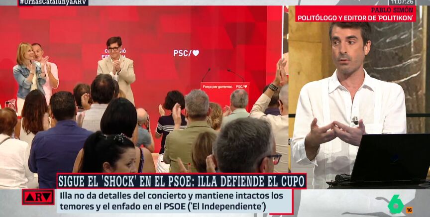 El politólogo Pablo Simónasegura en Al Rojo Vivo que para investir a Salvador Illa (PSC) como president de la Generalitat, "los números están garantizados, después de la consulta a las bases de ERC". "Es un hecho y es un hecho de gran calado porque por primera vez desde 2010 vemos que dentro de Cataluña se va a romper la política de bloques", afirma.