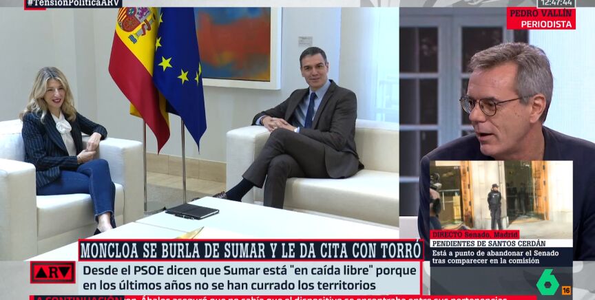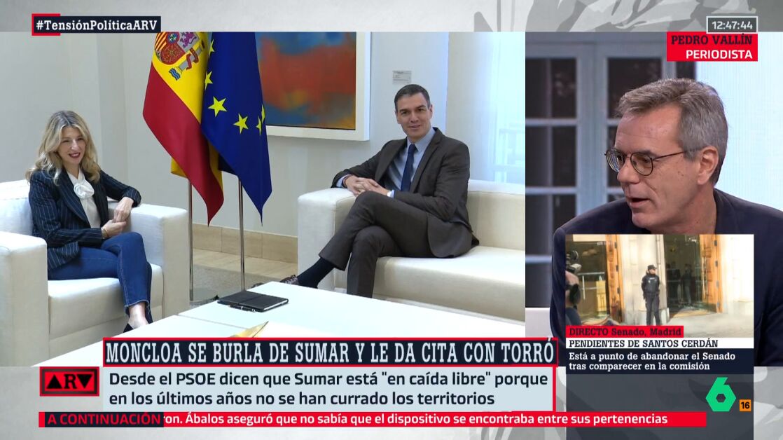 Sobre esta iniciativa se ha pronunciado el periodista Pedro Vallín en Al Rojo Vivo, donde se ha mostrado sorprendido por el planteamiento de Sumar. "Lo de la reunión me tiene perplejo, porque se supone que la comunicación entre el presidente del Gobierno y la vicepresidenta es fluida y constante, por teléfono y por WhatsApp. No entiendo muy bien esta especie de reunión de capitanes que organizan para el viernes ni qué se supone que va a resolver", ha afirmado.