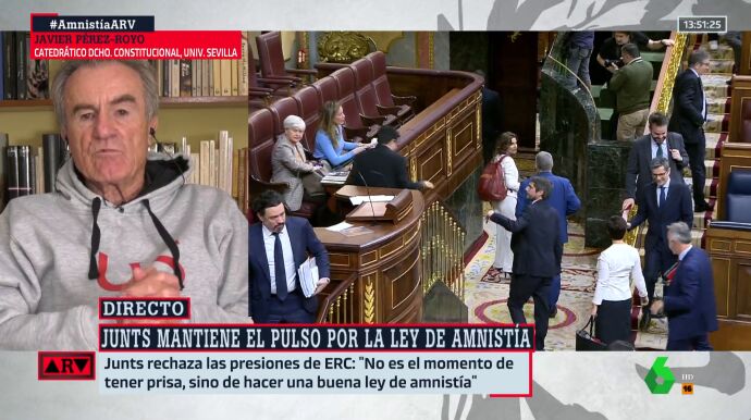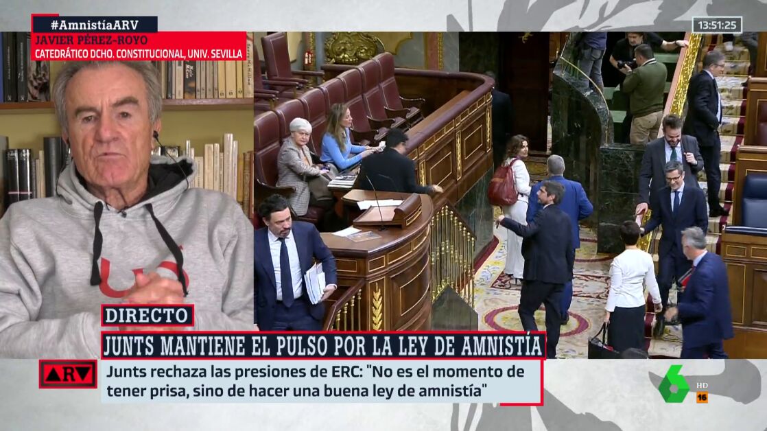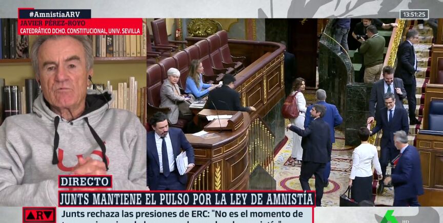 Javier Pérez-Royo confiesa en Al Rojo Vivo que no entiende la postura de Junts. "Puigdemont no tiene ningún problema mientras sea parlamentario europeo", destaca. Por tanto, reconoce que no comprende la razón por la que se empeñan en no aprobar la ley de amnistía tal y como estaba.