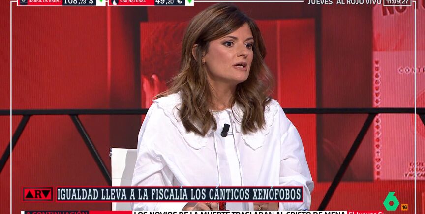 El líder de Vox se ha referido a los cánticos xenófobos en el RCDE Stadium de Cornellà-El Prat como "una manifestación de identidad", unas palabras que la periodista ha criticado. "Hay que ser contundentes", ha indicado.