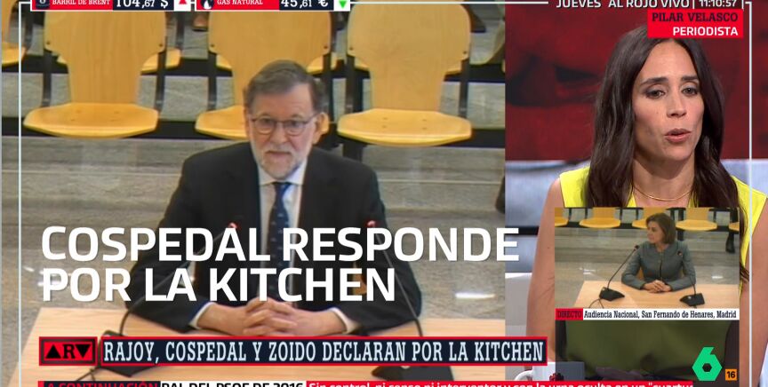 Para la periodista Pilar Velasco, "Mariano Rajoy ha hecho una declaración para salir vivo del banquillo al que va como testigo, pero no es creíble: no recuerda, no era responsable, no se le informó, no le reportaba el ministro Jorge Fernández Díaz y se enteró de la Operación Kitchen en 2021, después de la moción de censura, cuando llevábamos años los medios informando sobre ella...