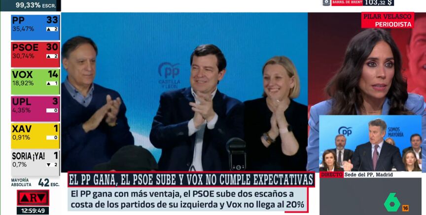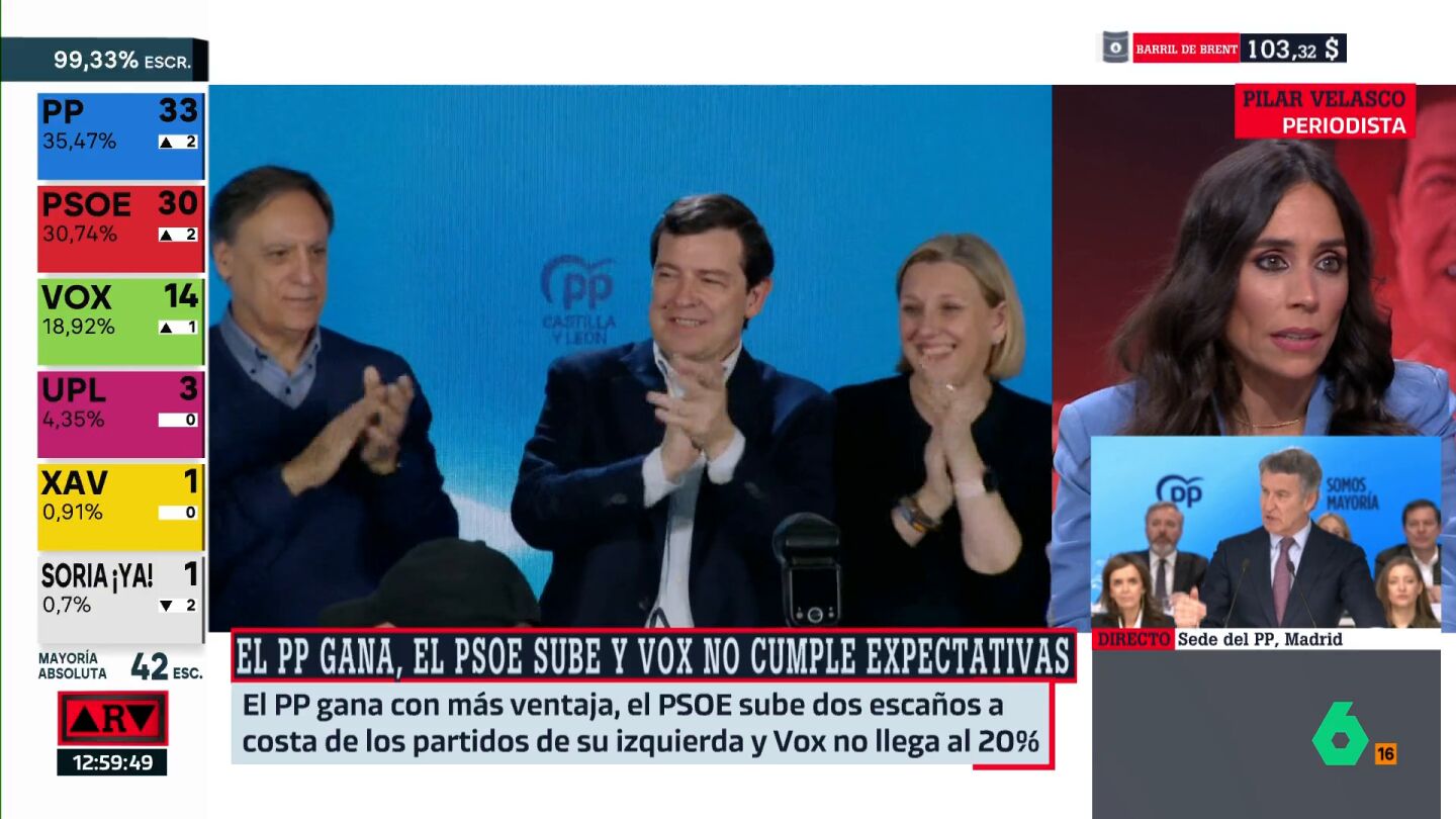 Tras escuchar estas palabras, la periodista Pilar Velasco recuerda que fue Feijóo quien abrió este ciclo electoral [adelantando las elecciones en Extremadura y en Aragón] y necesitaba una victoria contundente, una victoria que no tuvo ni en Extremadura ni en Aragón: en Castilla y León sí la ha tenido porque ha subido en porcentaje de votos y en escaños, algo que, unido al frenazo de Vox, "le puede servir al PP para equilibrar la relación entre ambos", analiza la periodista.