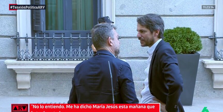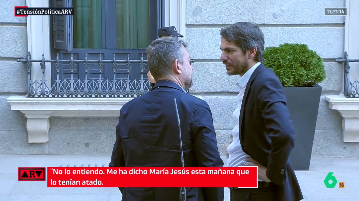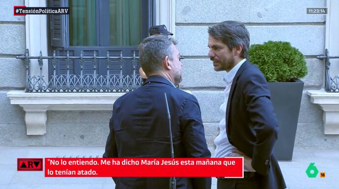 En las imágenes que pueden ver sobre estas líneas se observa cómo el ministro, con bastante perplejidad y en catalán, le asegura a Álvaro no entender el movimiento de la formación que lidera Carles Puigdemont, ya que le había "dicho María Jesús [Montero] esta mañana [en el Consejo de Ministros] que lo tenían atado" y que fue "[Félix] Bolaños quien se ha enterado (...) de que no".