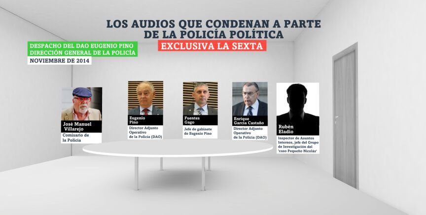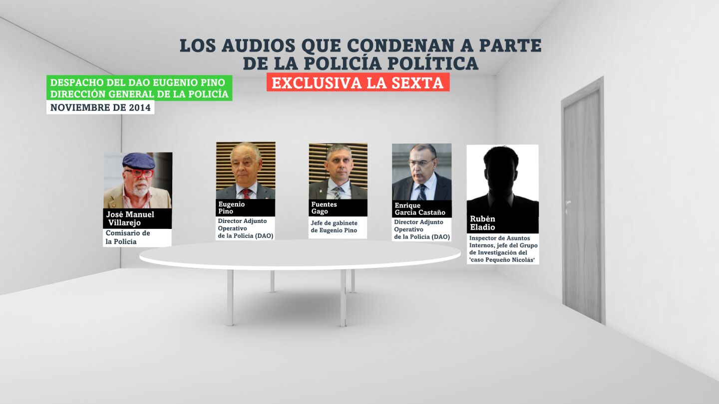Villarejo grabó a la policía política. laSexta en exclusiva nuevos audios que desvela hoy demuestran cómo parte de la llamada policía política en la época del Gobierno de Mariano Rajoy, presionó al policía que investigaba al comisario José Manuel Villarejo por haberle incluido en las pesquisas sobre el caso del Pequeño Nicolás.