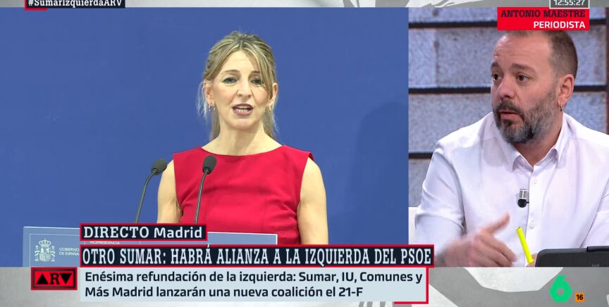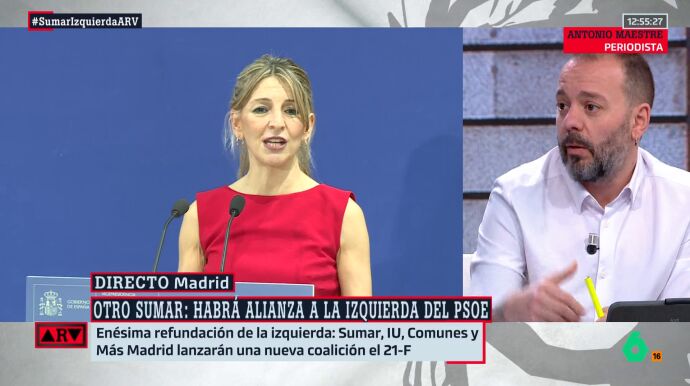 El periodista y escritor Antonio Maestre reacciona a la noticia del día con respecto a la izquierda del tablero político: IU, Sumar, Más Madrid y Comunes lanzarán su alianza de izquierdas de cara a las próximas elecciones generales el 21 de febrero, justo tres días después del encuentro entre Gabriel Rufián y Emilio Delgado, de Más Madrid, en la ronda de contactos que el de ERC quiere hacer con los líderes de la izquierda del país.