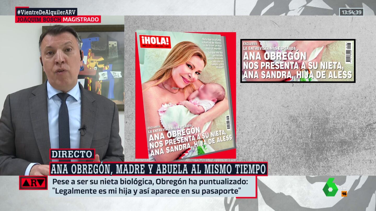 Pero si Ana Obregón es la abuela, ¿jurídicamente puede ser también su madre? Esta ha sido la pregunta que se ha formulado en el programa Al Rojo Vivo, al que ha sido invitado el magistrado Joaquim Bosch, quien ha puntualizado que "hay que partir de una premisa que lo condiciona todo: la regulación en España de esta materia".