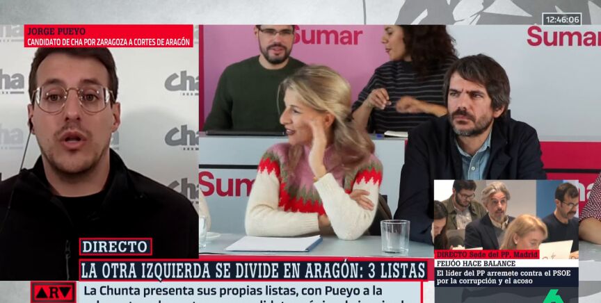 Pueyo explica que "políticamente hay que saber leer el momento que estamos viviendo": "Es esencial que la gente entienda que mucho votante desencantado del PSOE es muy probable que vire al PP o que es mucho más probable que vire a la Chunta Aragonesista, que no tiene casos de corrupción". Preguntado sobre si acudirían con Sumar si se convocaran elecciones generales en 2026, Pueyo afirma que "cuando lleguemos a ese río, cruzaremos ese puente": "Lo que ha estado intoxicando es que había dos partidos que se medían para ver quién lideraba la gran coalición de izquierdas en el Estado, eso ha hecho explosionar lo que había en Aragón".