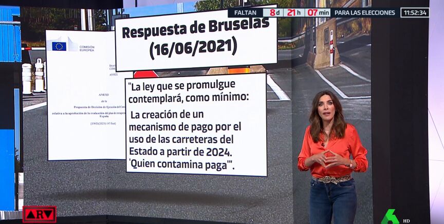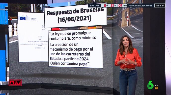 Este documento fue el que envió el Gobierno y la respuesta de la Comisión Europea llegó más tarde, el 16 de junio de 2021, donde indica que acepta la propuesta del Ejecutivo español. Además, en la respuesta Bruselas señala que la "ley que se promulgue contemplará, como mínimo: la creación de un mecanismo de pago por el uso de las carreteras del Estado a partir de 2024. 'Quien contamina paga'".