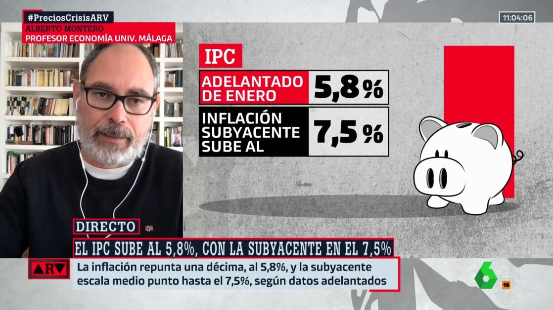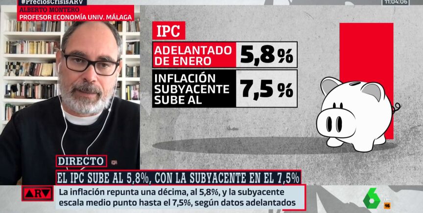 Tras conocerse el dato adelantado del IPC de enero, el profesor Alberto Montero analiza en Al Rojo Vivo la evolución de la inflación y, en particular, de la inflación subyacente, que se eleva al 7,5%. ¿Por qué sube tanto?
