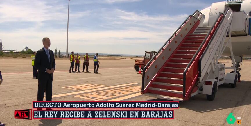 "Es impresionante ver al jefe del Estado, al rey de España, a pie de pista (para recibir a Zelenski)", afirma el periodista de El Mundo, Carlos Segovia, en directo para Al Rojo Vivo segundos antes de que Felipe VI reciba al presidente de Ucrania en Barajas, en su visita a España. "Es algo muy inusual", insiste el periodista.
