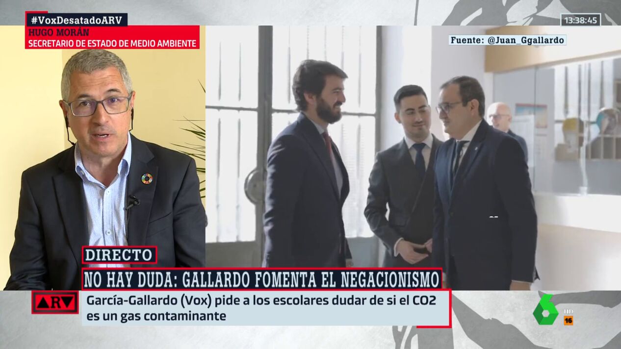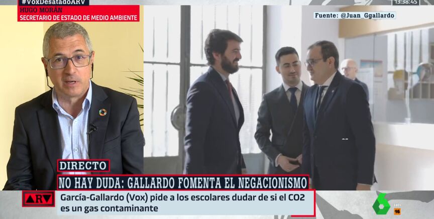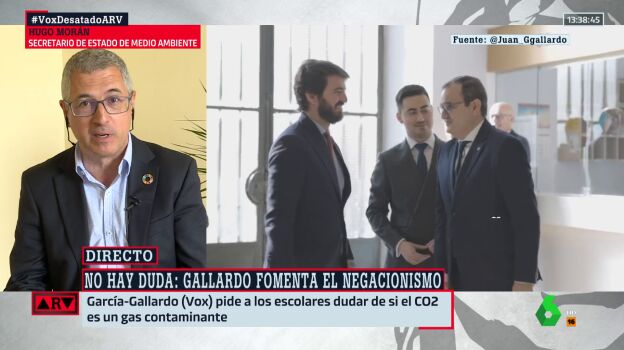 El secretario de Estado de Medio Ambiente, Hugo Morán, ha criticado que el vicepresidente de la Junta de Castilla y León, Juan García-Gallardo, fuera a un instituto a cuestionar las verdades científicas sobre el dióxido de carbono (CO2) sin tener ninguna formación para hacerlo.