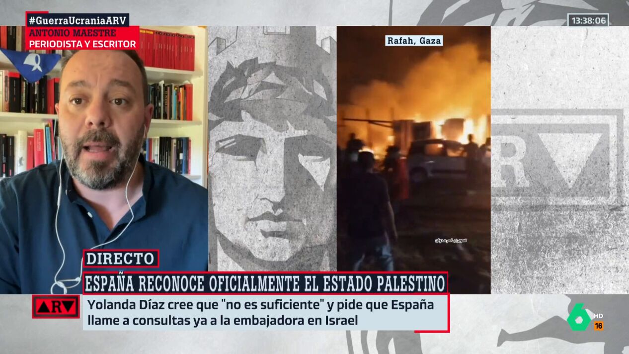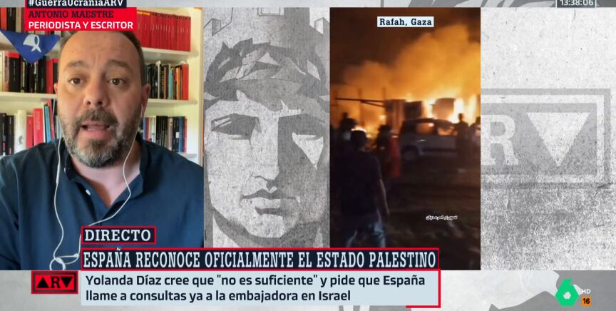 El periodista y escritor Antonio Maestrecelebra el reconocimiento por parte de España del Estado palestino: "España siempre ha creído en la solución de los dos estados, por lo que reconocer al estado de Palestina es un paso obvio y lógico. Es evidente y además una reivindicación histórica por parte de la izquierda", afirma en Al Rojo Vivo.