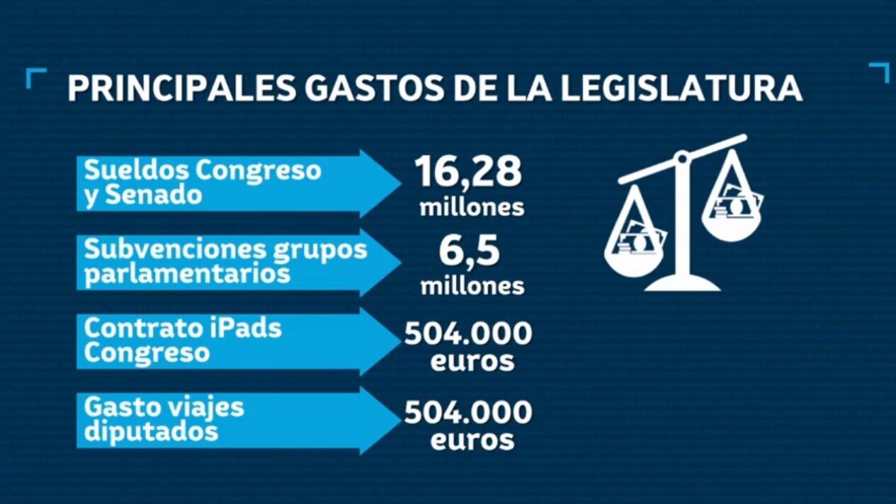 En concreto, la mayor partida ha ido dedicada a los sueldos de los diputados, que han seguido cobrando sus sueldos y ayudas públicas suponiendo un coste de 16,28 millones de euros. La siguiente partida que más gasto ha supuesto es la de ayudas a los partidos (6,5 millones). Por último, el otro millón se divide entre el contrato de ipads para los diputados y viajes de los parlamentarios.