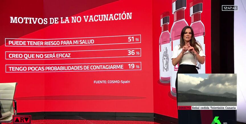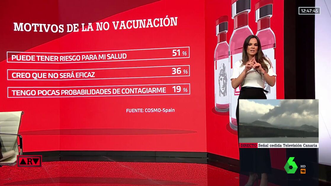 Este porcentaje minoritario de la población manifiesta distintos argumentos para no recibir la inyección. El 51% no lo hace porque cree que la vacuna puede presentar riesgos para la salud. El 36% lo hace porque no la considera eficaz y el 19% apunta que creen que tienen pocas posibilidades de infectarse. Además, el 21% afirma que no se protegen, precisamente, porque no creen en las vacunas.