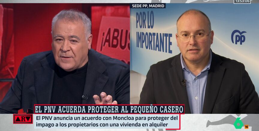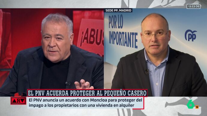 En su entrevista con Antonio García Ferreras, Tellado también muestra su rechazo al acuerdo entre el Gobierno y el PNV para modificar la moratoria antidesahucios de forma que se dé seguridad jurídica a los propietarios a la par que se garantiza la no expulsión de los inquilinos vulnerables: "Me parece una tomadura de pelo, el PNV dice que aquí hay derecho a la propiedad privada, pero un poquito solo".
