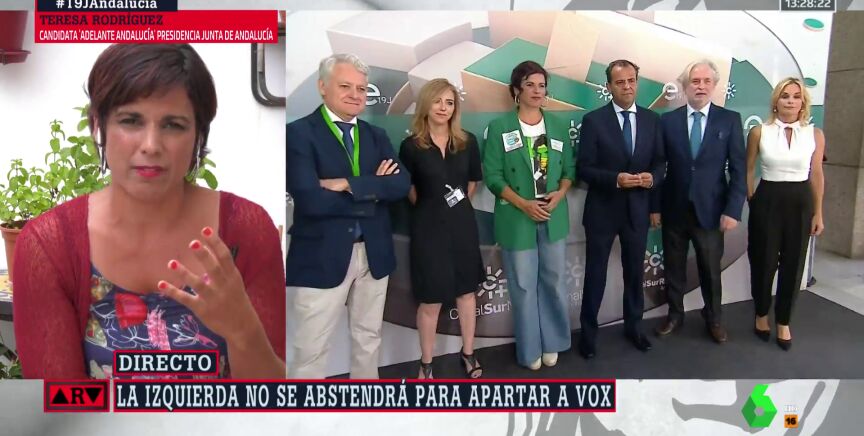Así lo ha afirmado esta mañana en Al Rojo Vivo Teresa Rodríguez, candidata de Adelante Andalucía en las elecciones de este domingo, 19 de junio. "No blanqueamos al PP", ni "a la derecha", ha dicho, cuando Antonio García Ferreras le ha preguntado si sus diputados se abstendrían en caso de que fuera necesario para evitar así un gobierno de Juanma Moreno con Vox. La candidata de Adelante Andalucía ha asegurado con rotundidad que no lo harían, ya que sería "perjudicial para el panorama político".