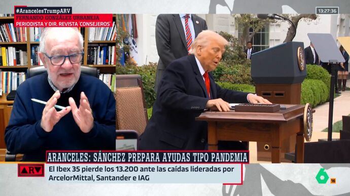 Fernando González Urbaneja, periodista y director de la revista 'Consejeros' asegura en Al Rojo Vivo que ha seguido la comparecencia del presiente Sánchez y le ha parecido "muy bien", así como la posición del líder de la oposición, Alberto Núñez Feijóo. En cambio, señala que "los de Vox tienen que hacérselo mirar. Mi abuela les diría: '¿Pero estáis bobos?' Porque la única explicación es que son bobos. Lo que ha dicho Abascal y el portavoz económico de Vox es de aurora boreal".Por otro lado, Urbaneja destaca dos puntos clave: primero, la dura respuesta que ha dado el presidente a los americanos, al decirles que "esto no es así, que han roto las reglas del juego y que deben reflexionar"; y segundo, la alusión a la importancia de que la UE esté unida. "Hay que tomarse que la integración europea es un deber y la mejor profilaxis contra esta enfermedad que nos trata de transmitir este mercachifle de cuarta, tal como le llamó Felipe González", finaliza Urbaneja. En el vídeo podemos ver al completo su intervención.