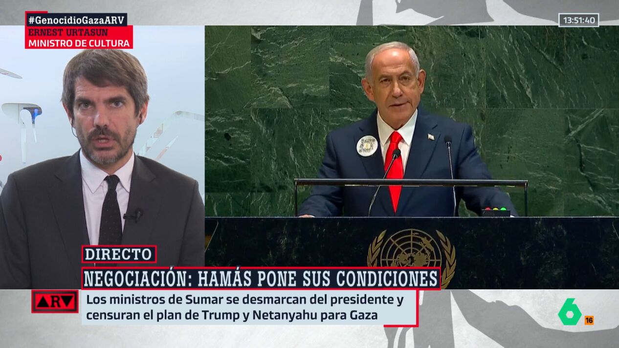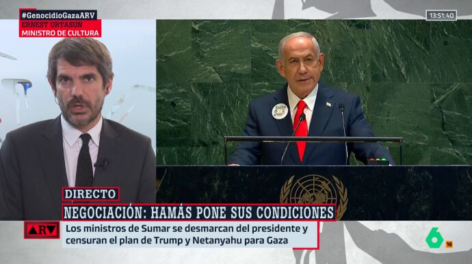 Ernest Urtasun ha explicado en Al Rojo Vivo por qué no están de acuerdo con apoyar el plan para Gaza que ha presentado el presidente de Estados Unidos, Donald Trump. "Nos preocupa que rompe los grandes consensos alrededor de lo que era el respeto a las fronteras del 67", ha detallado.