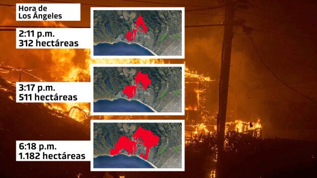 Para entender la magnitud de la extensión del incendio que ha arrasado barrios enteros en Los Ángeles, California (EEUU), no hay más que analizar la rapidísima propagación de las llamas en las primeras horas de los fuegos, así como ver el espacio quemado de haber producido en otras ciudades.