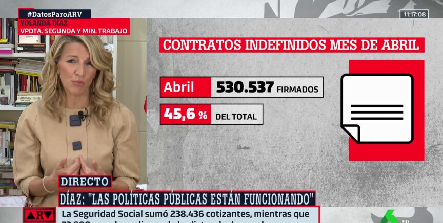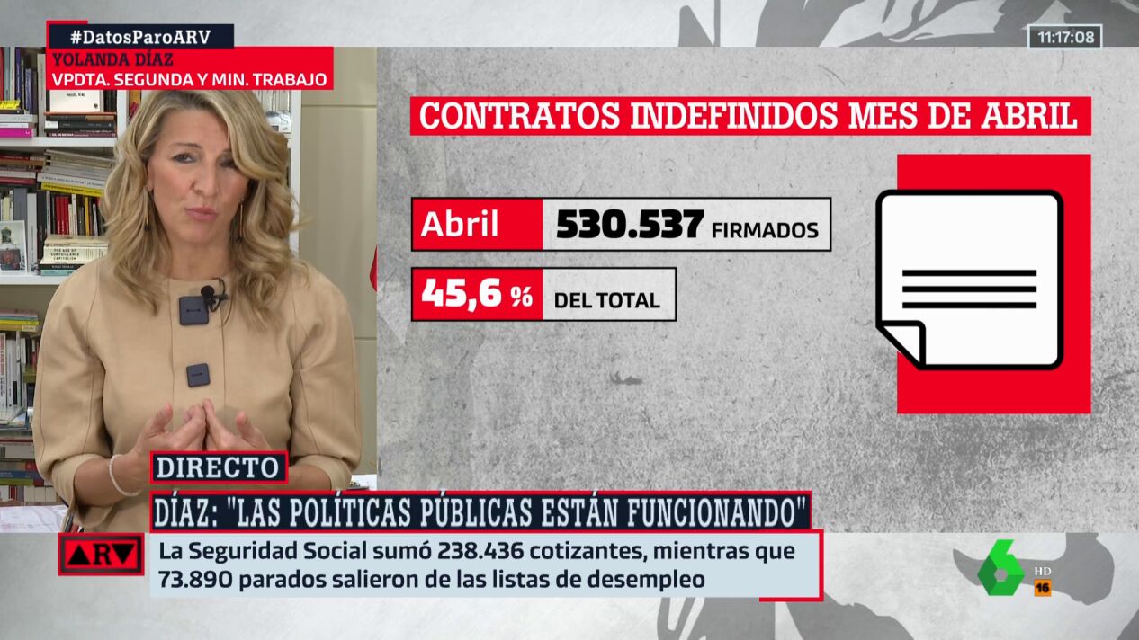 Yolanda Díaz ha indicado en Al Rojo Vivo que los datos del paro demuestran que "las políticas públicas están funcionando", asegurando que esto se ha conseguido "gracias al diálogo social".