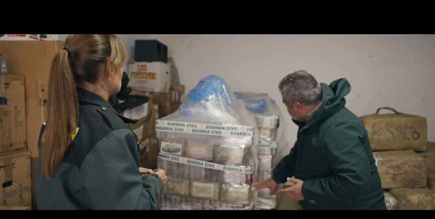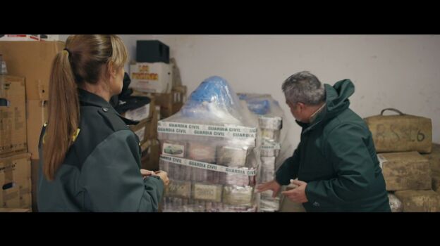 "Aquí hay varias toneladas de droga que se van a cargar en este camión y se va a proceder a su traslado y destrucción", muestra Jalis de la Serna a cámara, a la que explica que se trata de "un dispositivo grande que moviliza a varios agentes". Jalis de la Serna explica que "mozos de almacén contratados por la compañía de transporte movilizan 8 toneladas de hachís" en sacos que pesan entre 35 y 40 kilos, cada uno. Dentro de estos sacos hay "droga incautada en diversas operaciones", explica uno de los agentes.