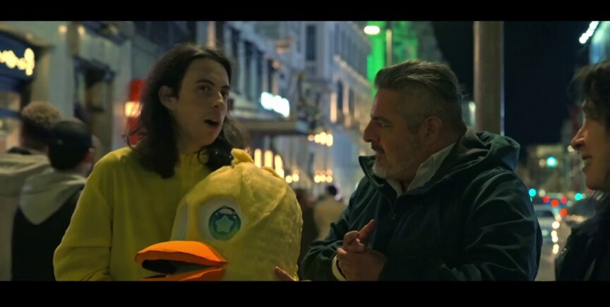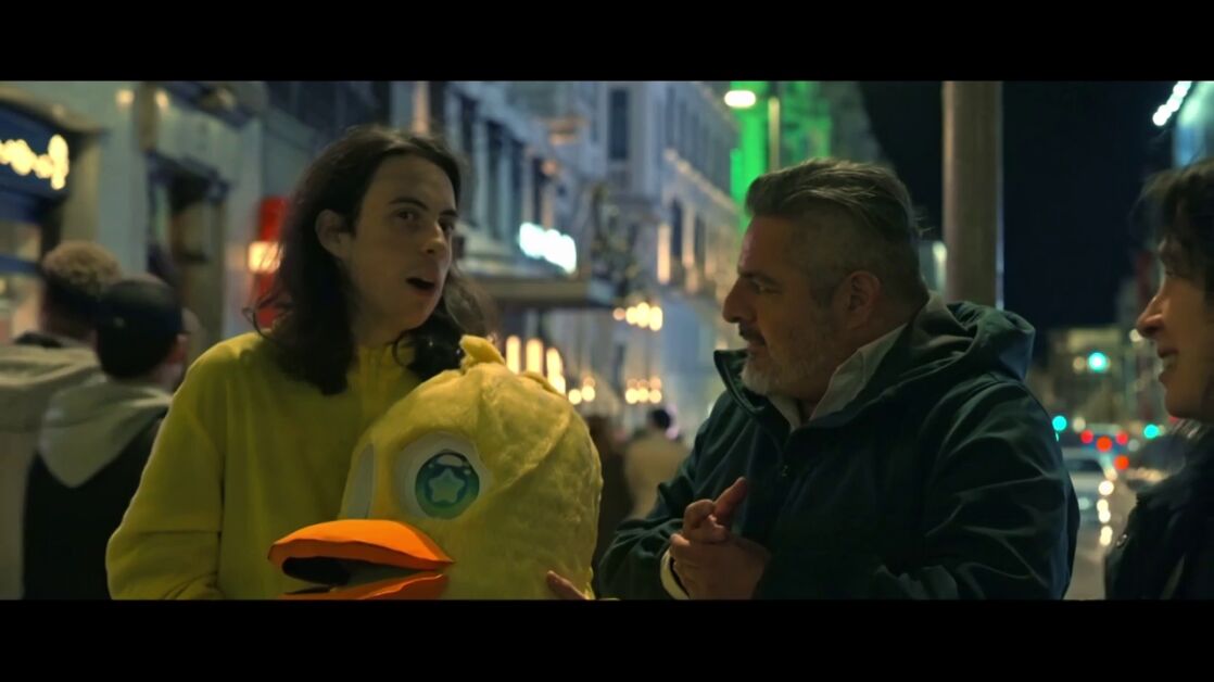 La reacción de Jalis de la Serna al ver a un joven vestido de pato: "Esto solo pasa en Gran Vía"