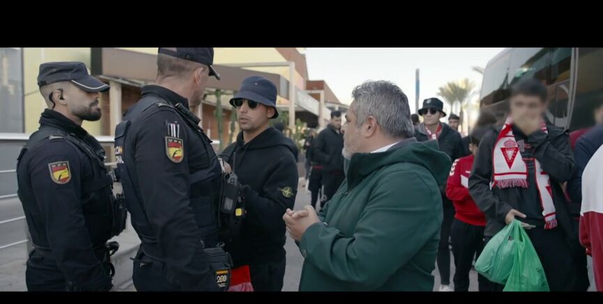 El periodista acompaña a las unidades de la Policía Nacional encargadas de mantener el orden público mientras cachean a los aficionados. "Le he dicho a uno de tus compañeros: si necesitáis colaboración, decídnoslo y, comunicándonos, nos vamos a entender perfectamente", le comenta un joven aficionado del Real Murcia a un policía, a lo que el agente responde: "La comunicación ya sabéis lo que es; no quiero problemas con la otra afición".