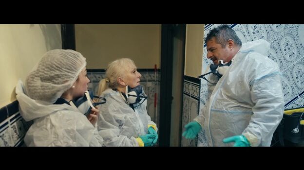 El calor que les dan los trajes de protección les obliga a hacer una breve pausa en el rellano, momento que el periodista aprovecha para entrevistar a la madre de Jonathan, de 65 años, y a la hija, muy joven. "Habiendo una necesidad... Tuvimos en la familia no un problema de este tipo, pero sí un aviso, y fue entonces cuando pensamos en dedicarnos a este tipo de limpieza", relata la señora.