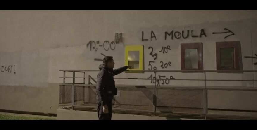 'Zazza el italiano' pasea de noche por la barriada de Franc-Moisin, en el barrio de Saint-Denis para ver qué se encuentra por allí, cuando ve algo que le llama la atención. "Si es lo que pienso, es increíble", anuncia el youtuber al ver un edificio con ventanillas y los precios de la droga en la pared. "2 gramos te cuestan 10 euros; 5 gramos, 20 euros; 10 gramos, 50 euros", está escrito. El copresentador de Apatrullando se asoma a una de las ventanillas para ver qué hay dentro. "Hay una habitación con muchas cosas abandonadas, parece como una antigua cocina", expone.