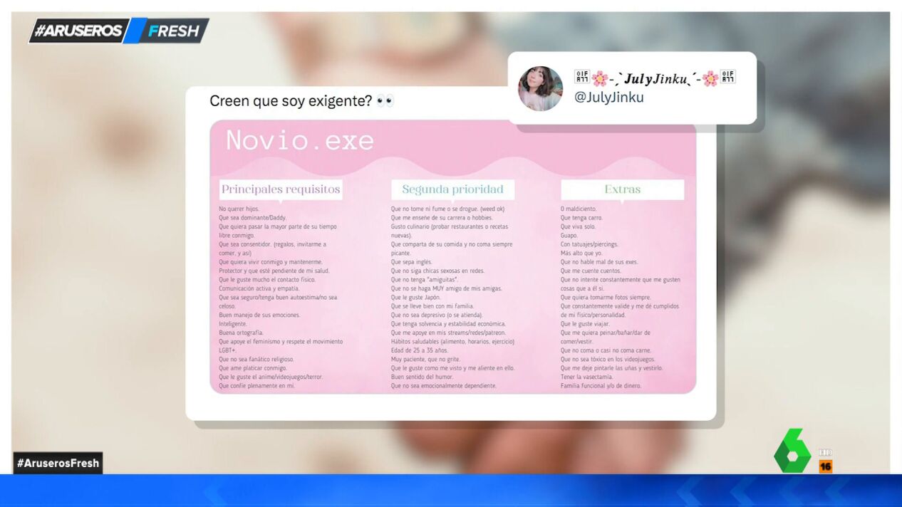 Entre las peticiones más bizarras se encontraban las de que "no siga a chicas sexosas en redes", "que no se haga muy amigo de mis amigas" y "que tenga la vasectomía", leía Hans Arús en Aruser@s. Los colaboradores del programa tenían claro que tras ese perfil se escondía la identidad de su compañera Patricia Benítez.