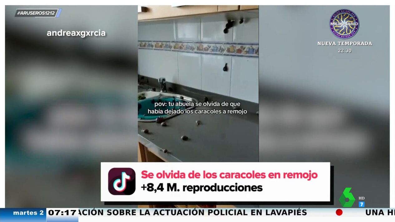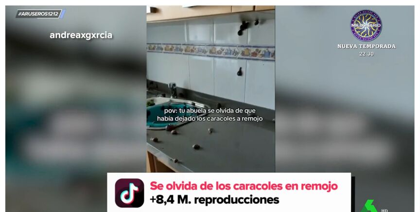 Con 8 millones de visualizaciones, la abuela de la usuaria de TikTok @andreaxgxrcia se ha convertido en viral, y no es para menos. A la pobre mujer se le ha olvidado que tenía los caracoles en remojo y cuando ha vuelto a casa se los ha encontrado en todos sitios menos en la sopa (vaya disgusto se hubiera llevado Celia Cruz), como vemos en el vídeo emitido también en Aruser@s.